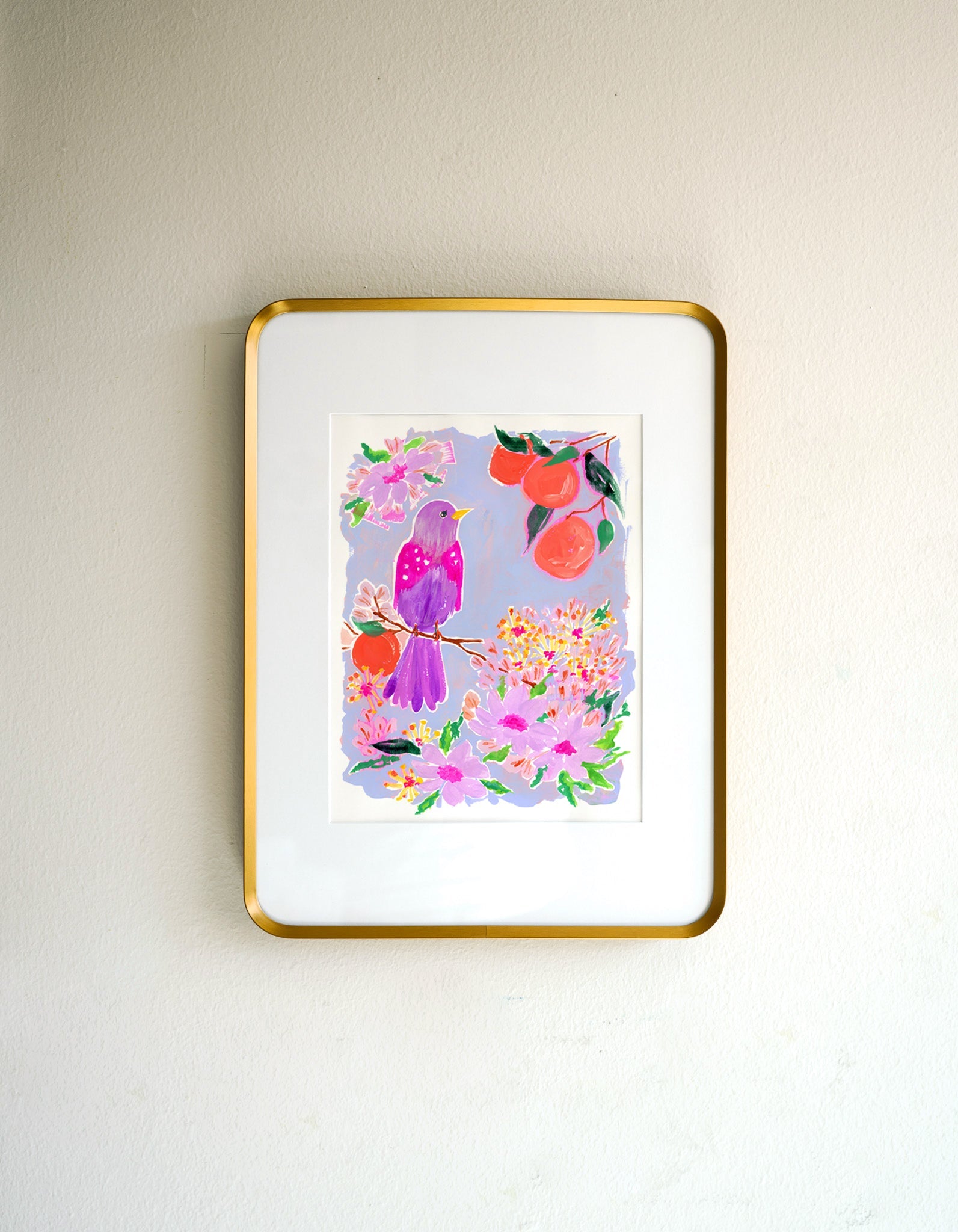 Part of my mixed-media collection "Flowers & Feathers," this piece blends watercolor, gouache, and acrylics to create a dynamic and lively composition. The playful colors and cheerful design make it an excellent addition to kitchens, living rooms, or any space in need of a fresh, citrus-inspired accent.