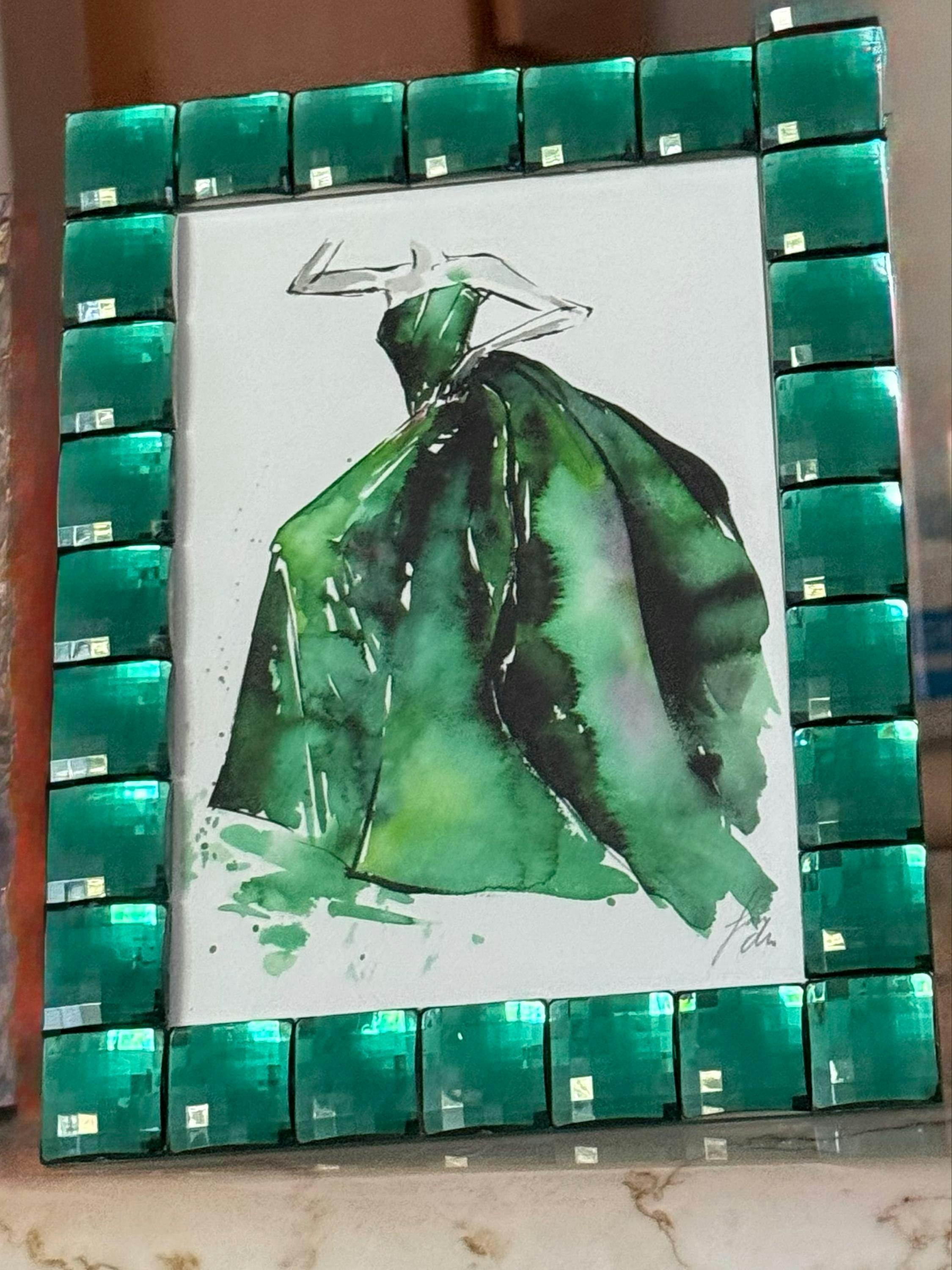 A fine art Giclée print of my original watercolor painting featuring a striking emerald green gown. With sweeping brushstrokes and a fluid silhouette, this artwork captures the timeless elegance and movement of couture fashion.
