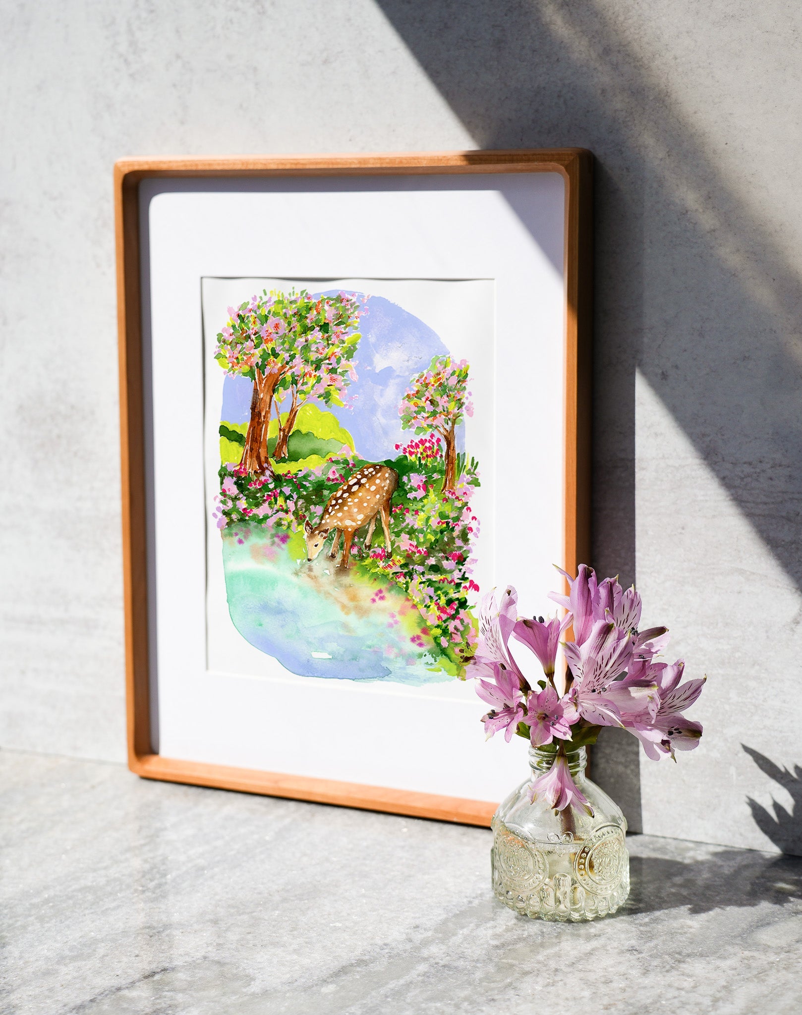 Spring Comes Gently is a watercolor art print that captures the soft arrival of the season. A young fawn bends toward a still pond, surrounded by flowering trees and the vivid greens of new growth. Painted with delicate brushwork and gentle light, this piece brings a calming presence to your space.